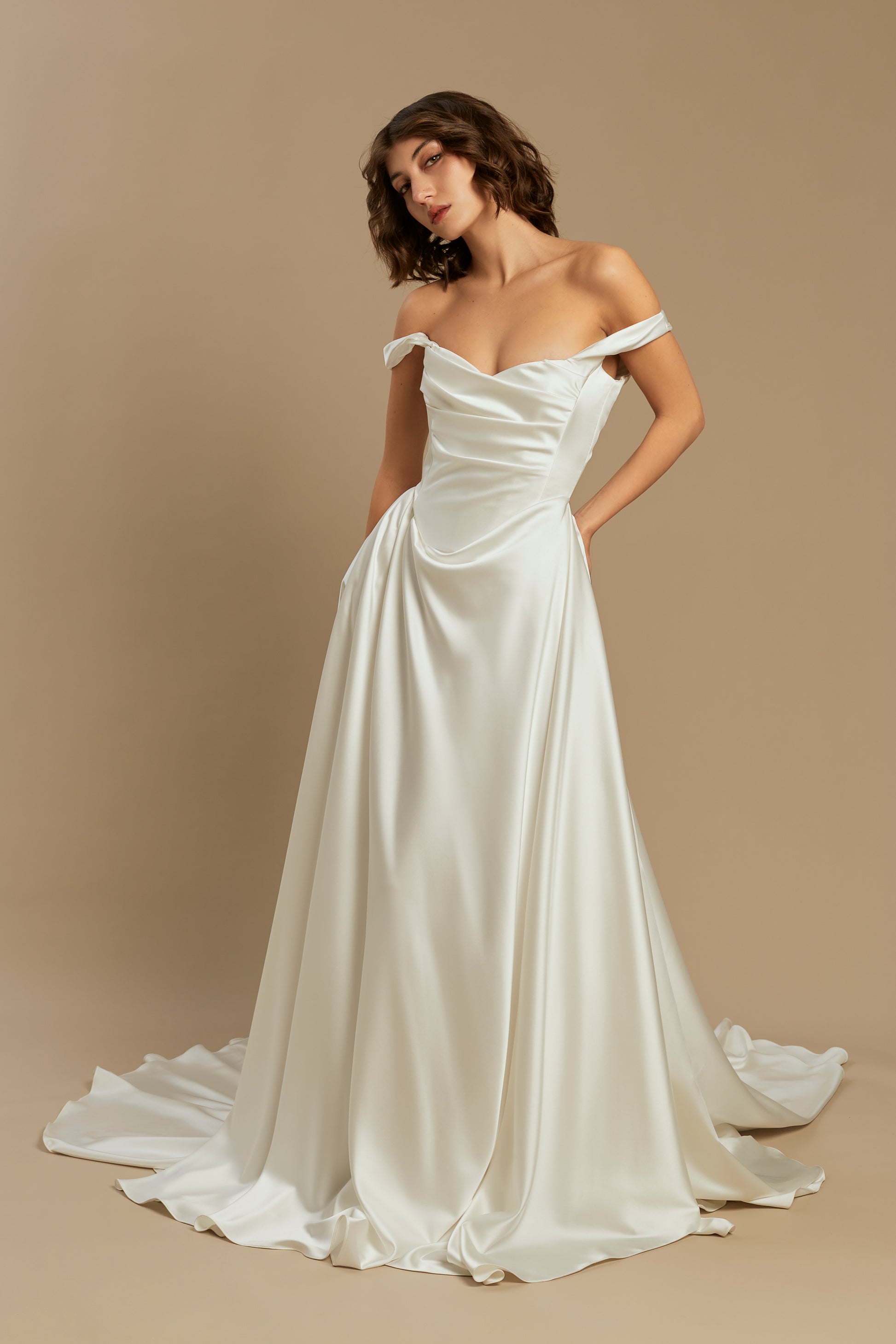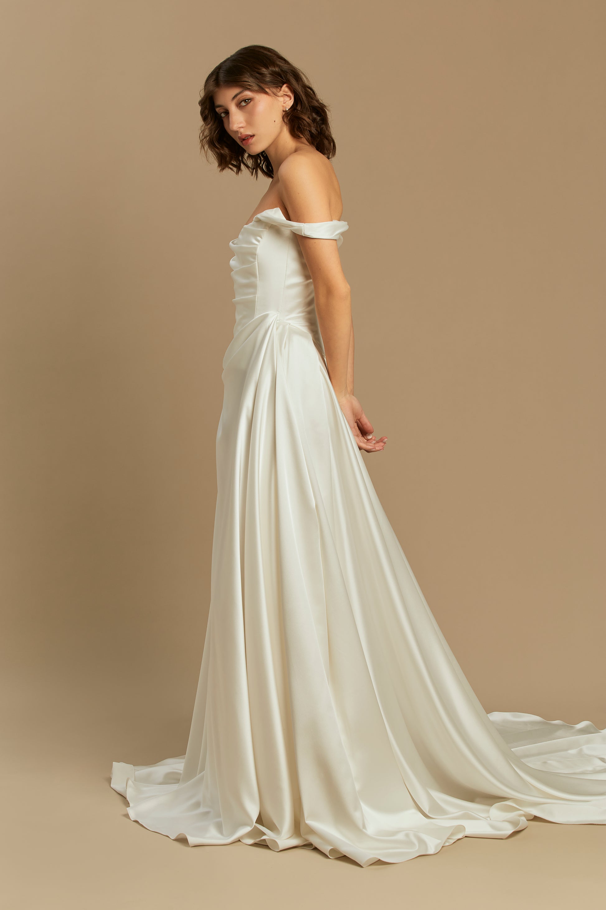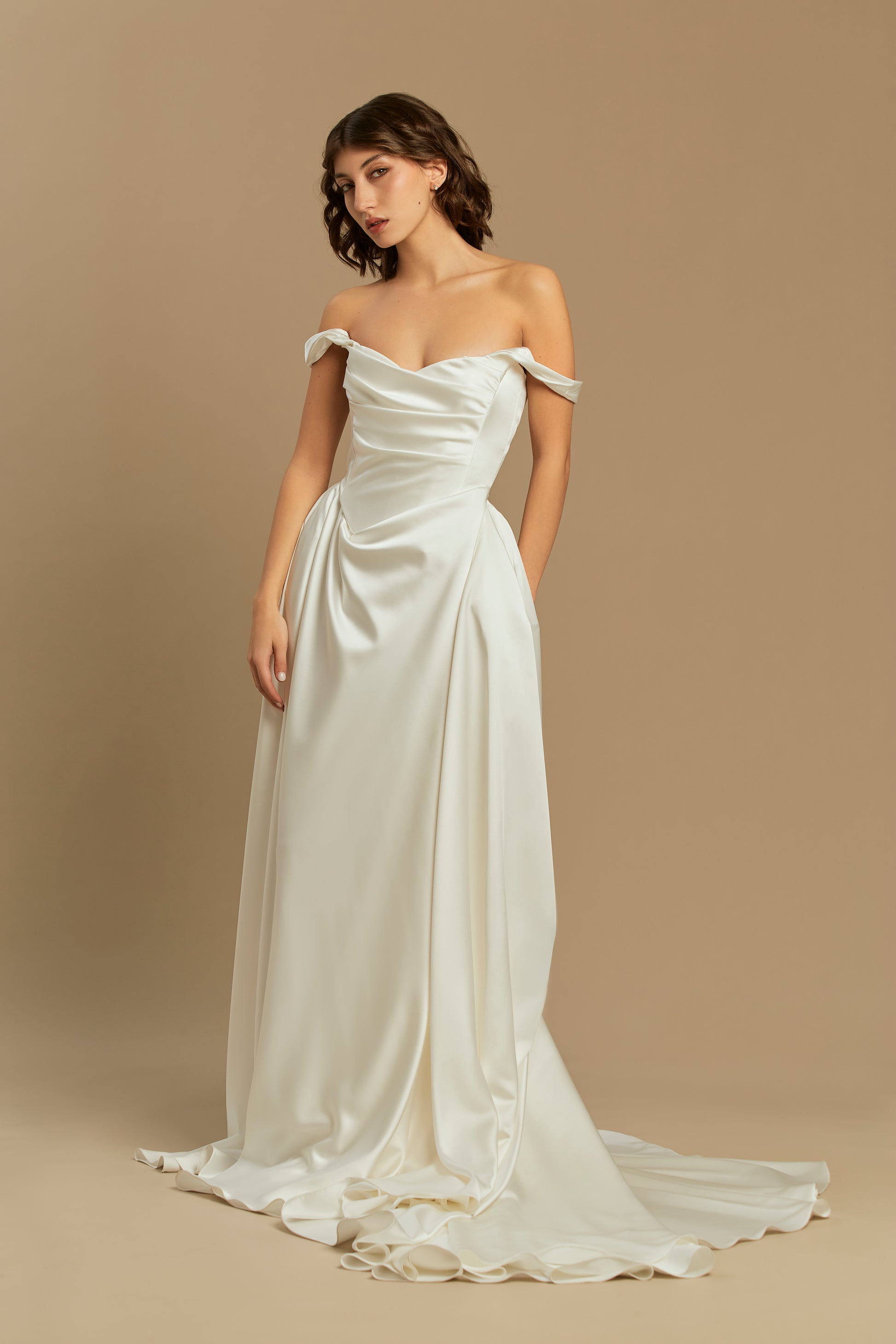 A refined design crafted from luxurious silk satin, offering the perfect blend of minimalist elegance and romantic volume. Featuring a beautifully fitted bodice and a full, pleated skirt with a striking 50 cm train, it creates a truly graceful silhouette. For a customizable touch, the straps can be worn securely on the shoulders or dropped delicately over the arms for a chic off-the-shoulder look. A versatile and breathtaking choice, flawlessly suited for any modern or classic wedding setting.