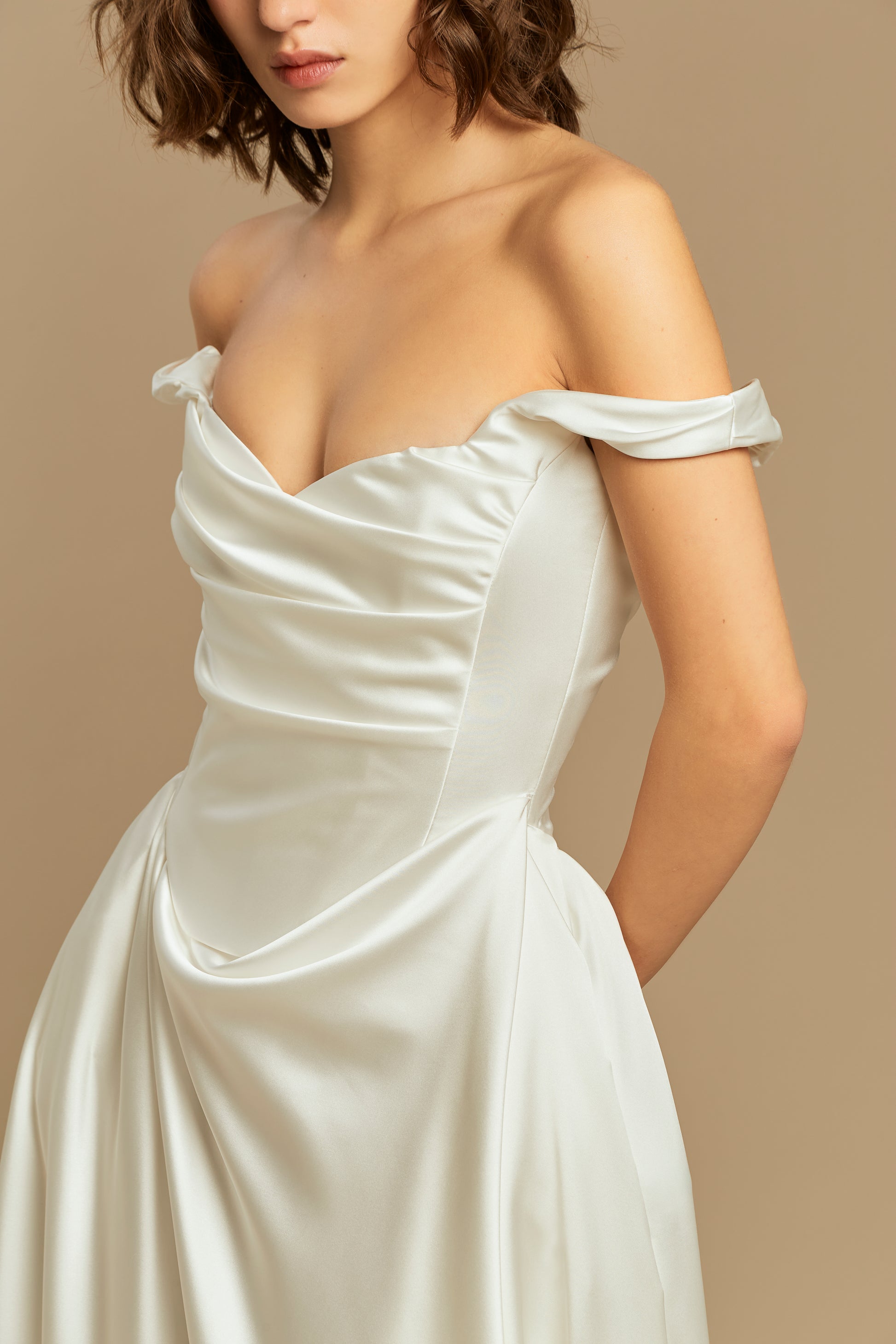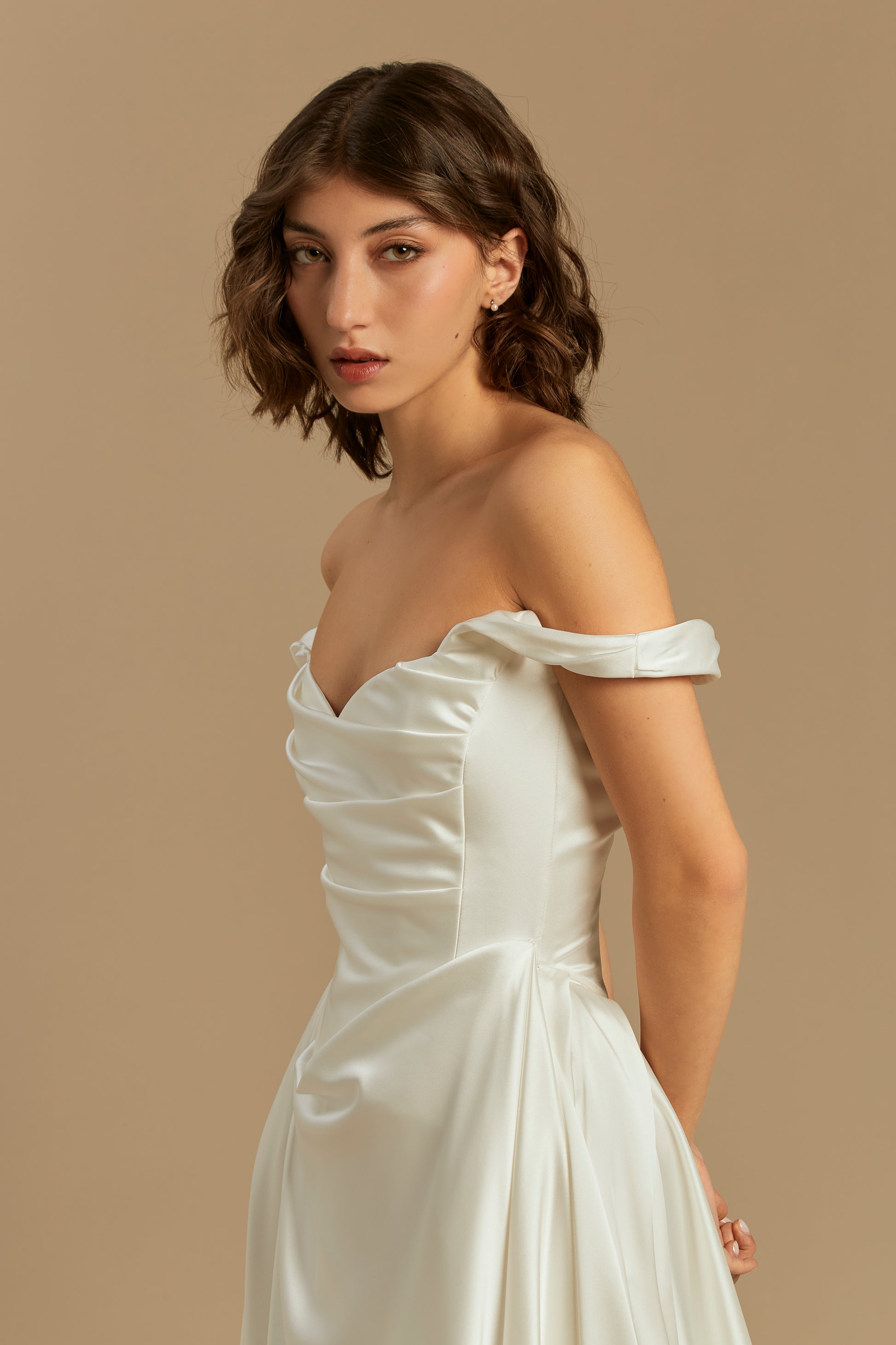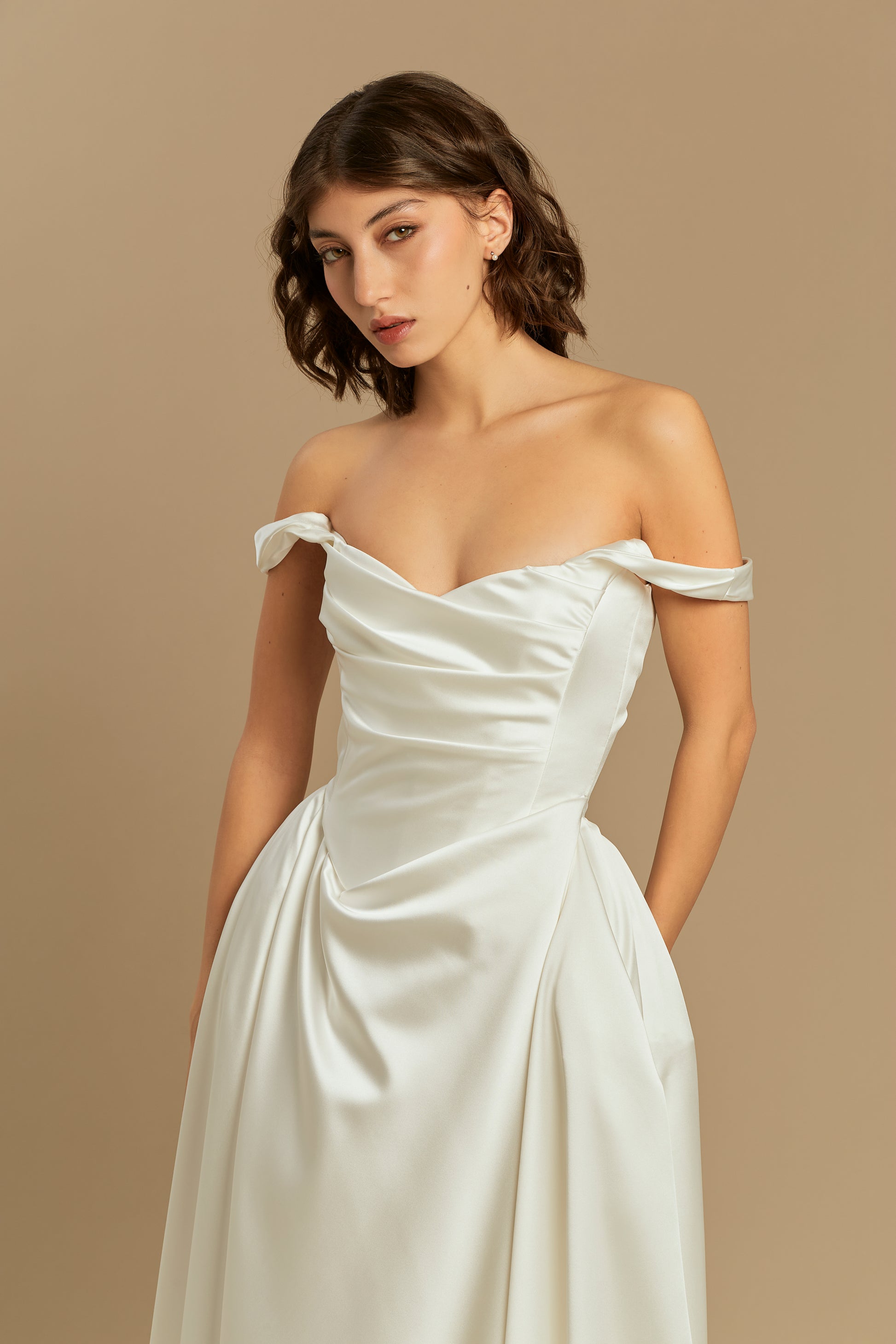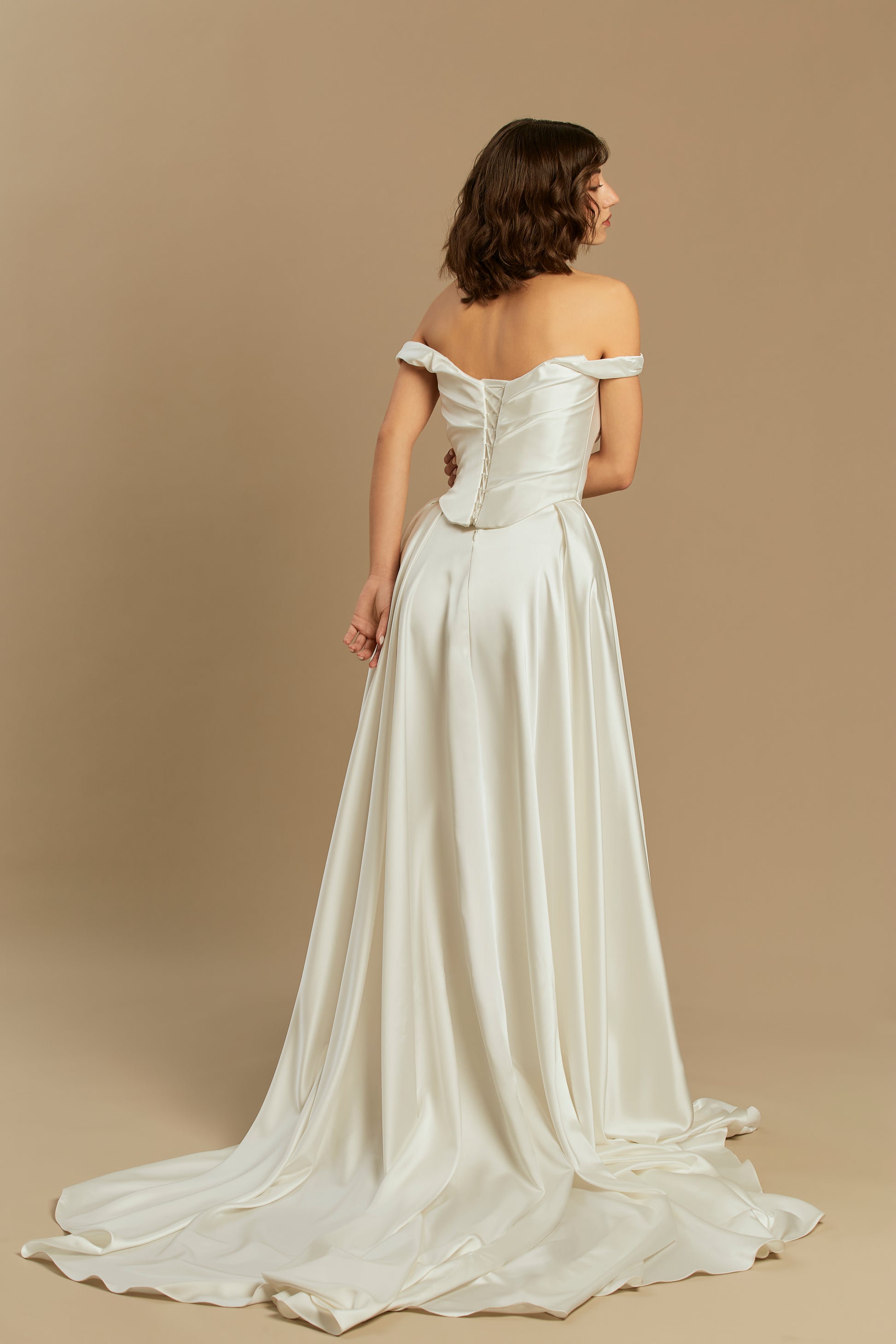 A refined design crafted from luxurious silk satin, offering the perfect blend of minimalist elegance and romantic volume. Featuring a beautifully fitted bodice and a full, pleated skirt with a striking 50 cm train, it creates a truly graceful silhouette. For a customizable touch, the straps can be worn securely on the shoulders or dropped delicately over the arms for a chic off-the-shoulder look. A versatile and breathtaking choice, flawlessly suited for any modern or classic wedding setting.