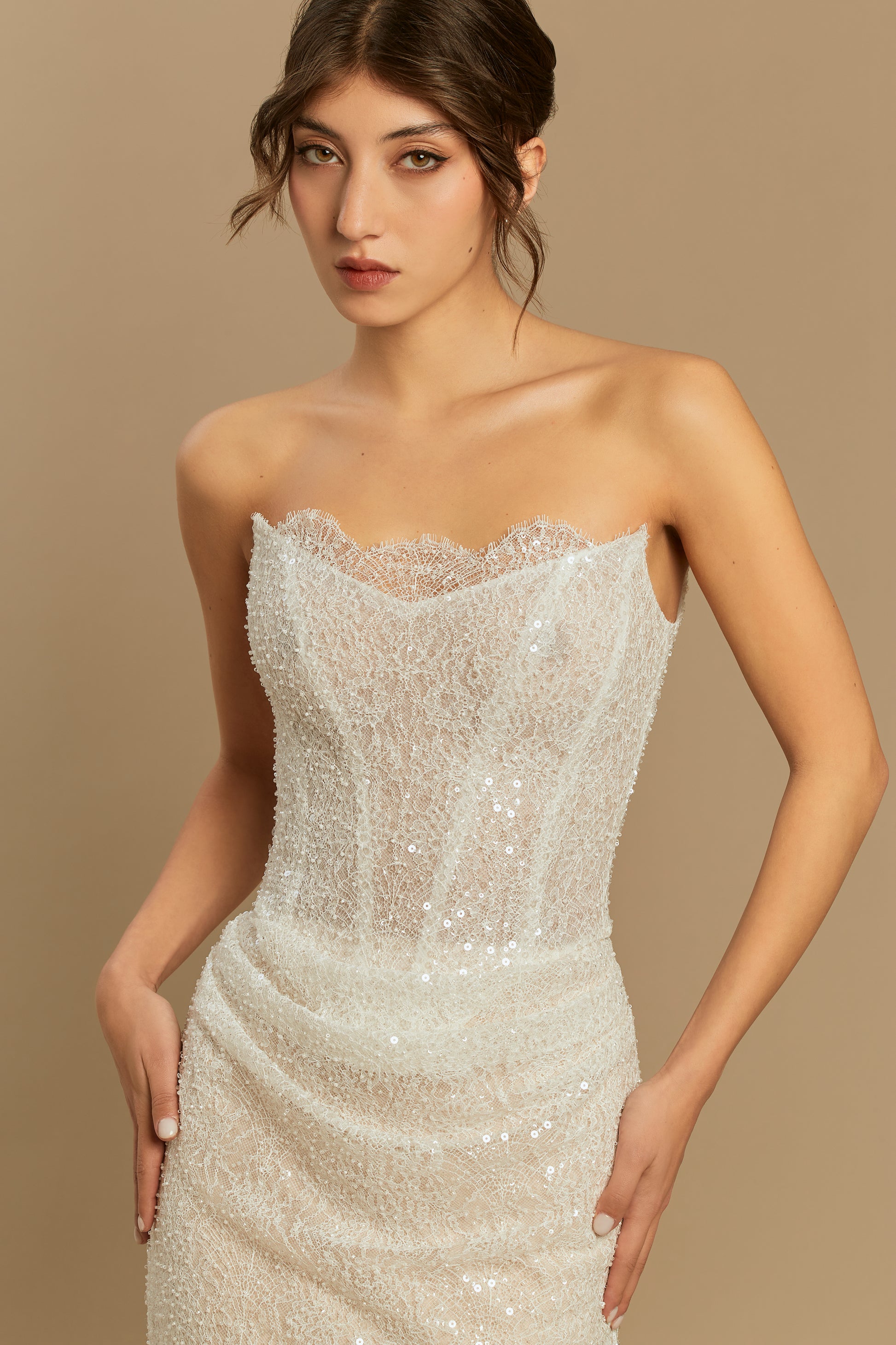 This lace mini dress takes luxury bridal wear into the after-hours. A meticulously tailored corset delivers an architecturally flawless fit, while a dusting of subtle shimmer catches every flash of the camera. Framed by dramatic, detachable sleeves, it offers a fleeting moment of tradition before you shed them for the dance floor. It is unapologetic luxury, crafted for a modern celebration.