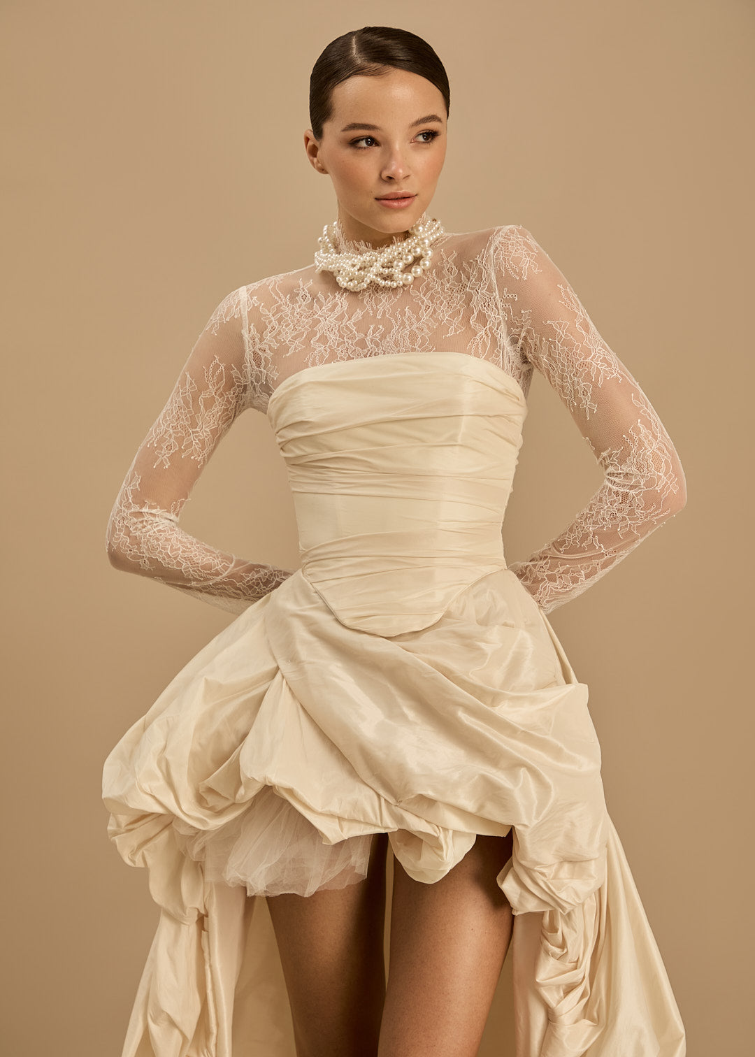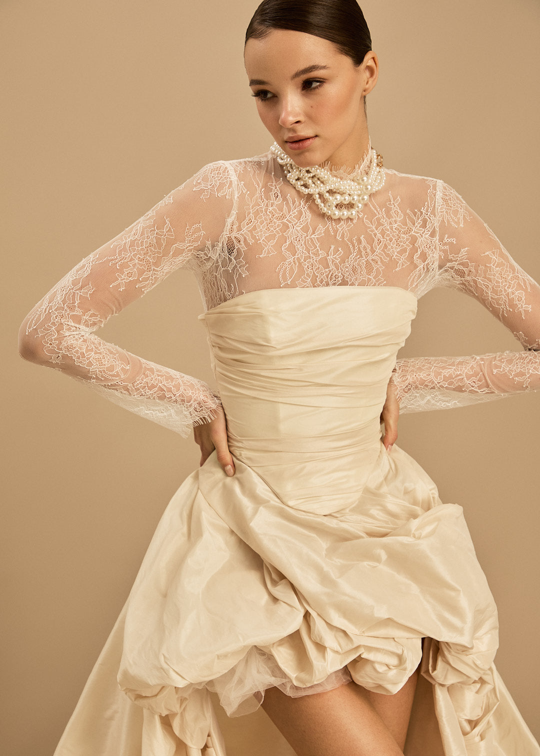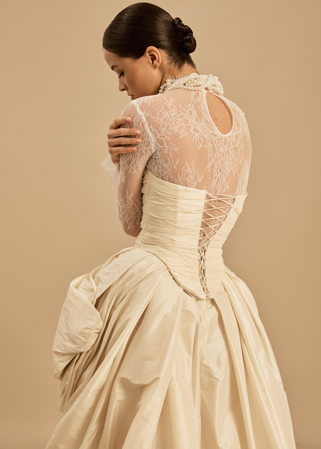 Vintage corset with draping on the top and ballon skirt wedding gown for stylish bride. Soft taffeta fabric, delicate drape, perfect fitting- is the best look for a luxury wedding. The set consists of three pieces: a separate corset, a skirt, and a top. You can mix and match them as you like.