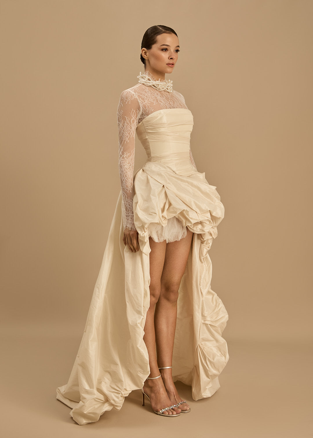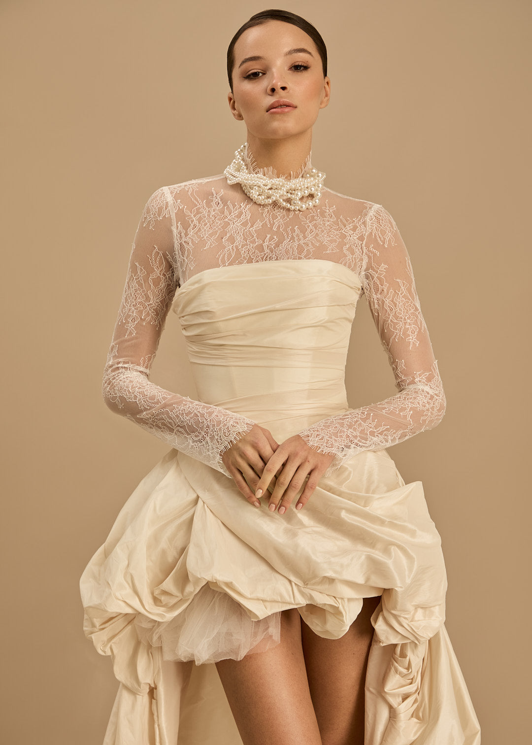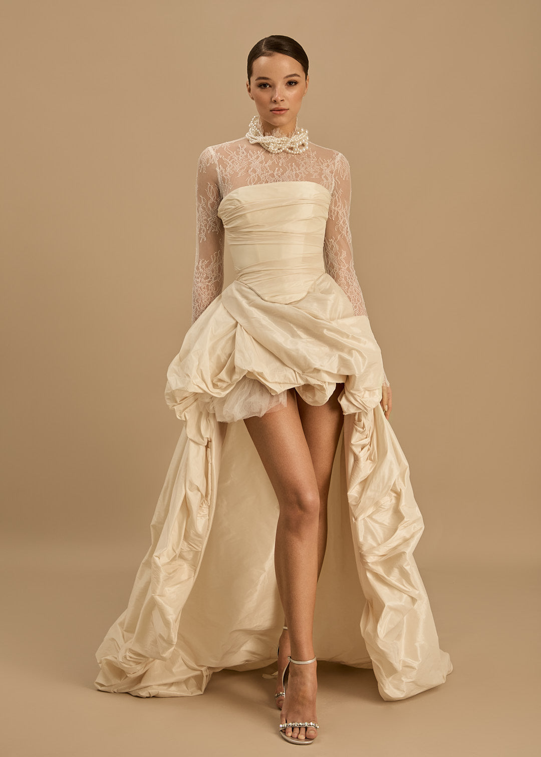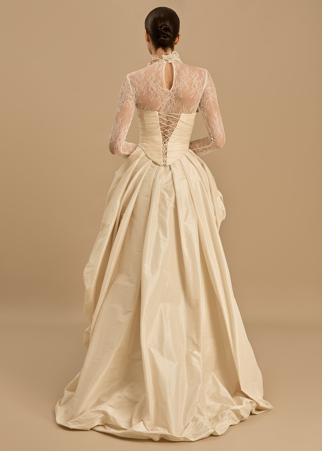Vintage corset with draping on the top and ballon skirt wedding gown for stylish bride. Soft taffeta fabric, delicate drape, perfect fitting- is the best look for a luxury wedding. The set consists of three pieces: a separate corset, a skirt, and a top. You can mix and match them as you like.